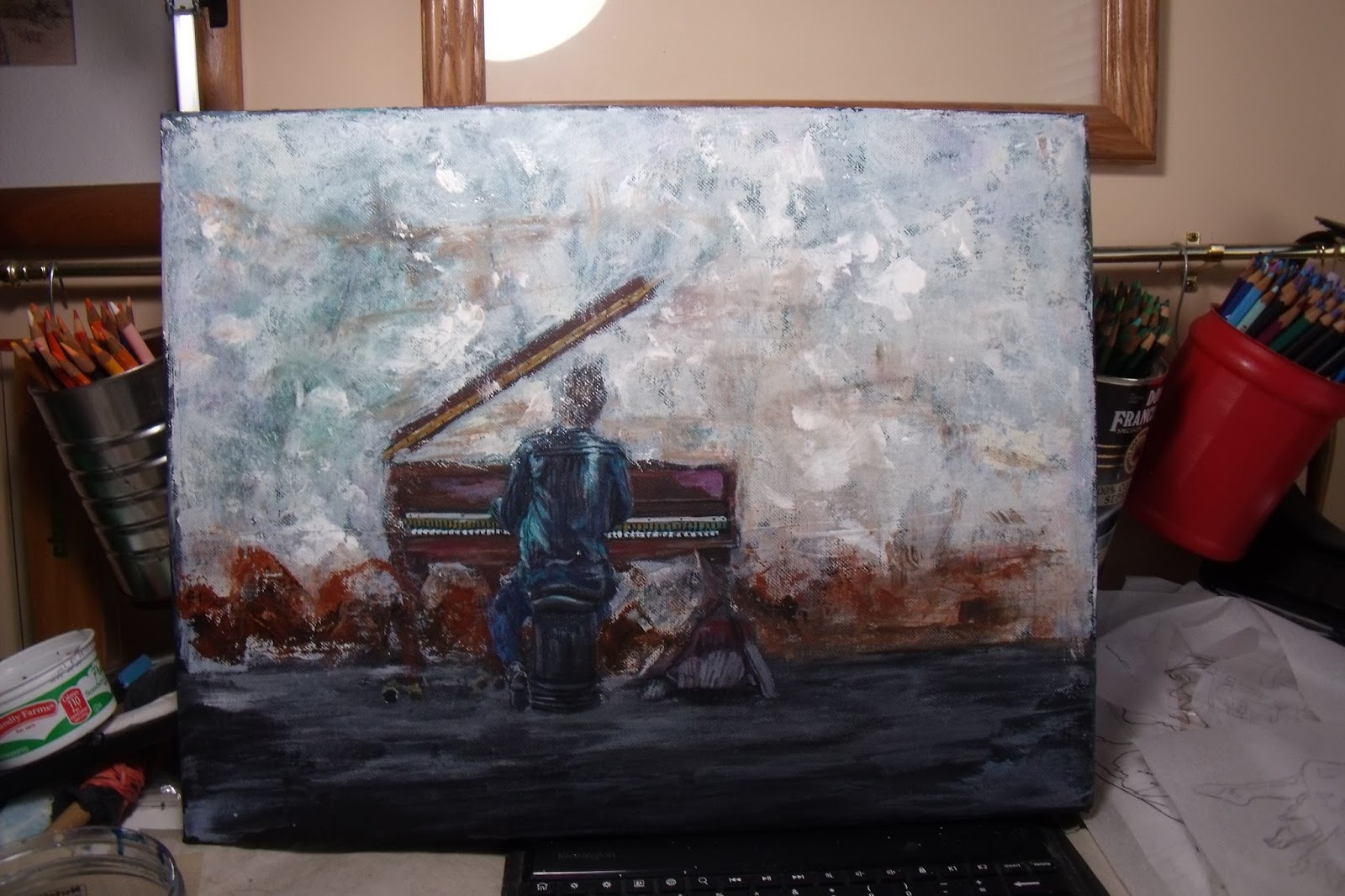 Here is the next in the performers series. Well I think I am finally done fighting with this piece. I want to thank Diane who told me I couldn't start over and had to figure out how to try to salvage it. Going to show the stages I went through because originally I fell back to what I always try to do, be more realistic. I just didn't have a clear plan for this one and just kept adding and changing on the fly. Hope at the end though I finally got it right. The biggest struggle with this one was trying to get movement and some life into the picture. The piano and player are pretty stagnant, so I decided to add the dog. Believe it or not I think putting the water bottle in on top of the knapsack also helped.